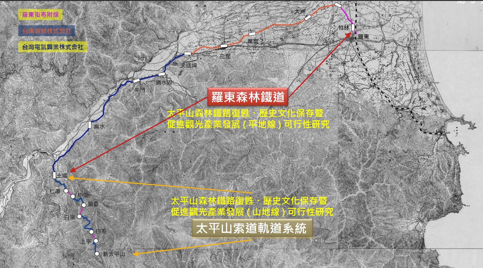 為推動觀光,宜蘭縣政府近年來規劃太平山森鐵復駛,在2022年與2023年分別提出平地線(原羅東森林鐵路)、山地線可行性研究送交通部、農業部審查。行政院於2024年12月召開「研商太平山森林鐵路復甦路線規劃及觀光鐵道發展會議」,會後決議請縣府將平地線與山地線2案可行性研究,整合修正成1案,再報交通部審查。