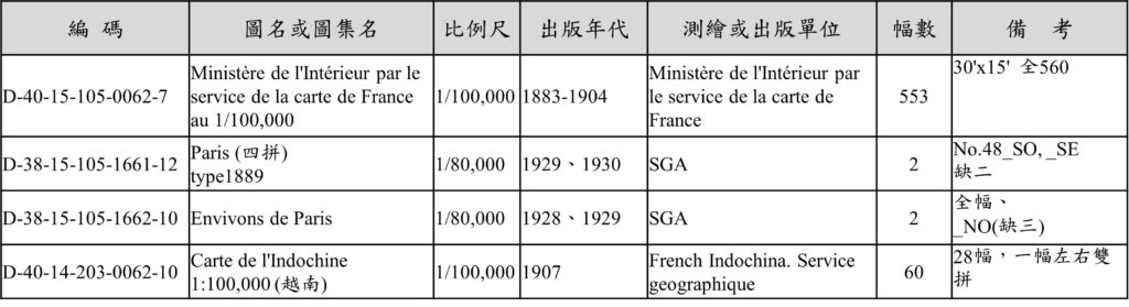 在中央研究院GIS研究專題中心與國防部第401廠執行歷史地圖數位典藏(廣惠)專案成果當中,檢整出軍版暨內政部版法國地形圖(1/80,000 & 1/100,000)圖資,參閱表1。本文所述之法國內政部版各式十萬分一歷史地圖之彙整表,參閱表2。