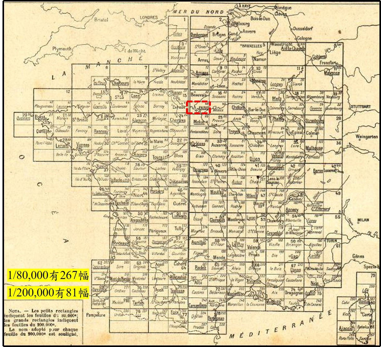 法國內政部1880年起運用總參版縮製改編發行《內政部版十萬分一地形圖》(MIS de la carte de France 1:100,000),圖幅接合表參閱圖4。