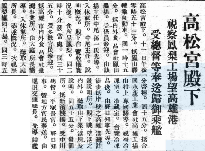 《臺灣日日新報》1933年7月13日報導:高松宮殿下(昭和天皇之弟)於1933年7月9日至11日,至高雄州進行四日視察。其間,9日搭第二艦隊停泊高雄港,10日視察恆春鵝鼻燈塔等地,入住四重溪溫泉旅館;11日先參訪石門古戰場、琉球番民之墓,午後抵達鳳山驛,轉乘自動車前往內外食品會社鳳山農場,觀閱鳳梨收穫實況,並品嘗所呈鳳梨。之後搭乘自動車至高雄市區,視察內外食品會社臺灣事業所的鳳梨罐頭工場,以及合同水產工業會社高雄工場。12日出席壽山館活動後,搭船離開高雄。