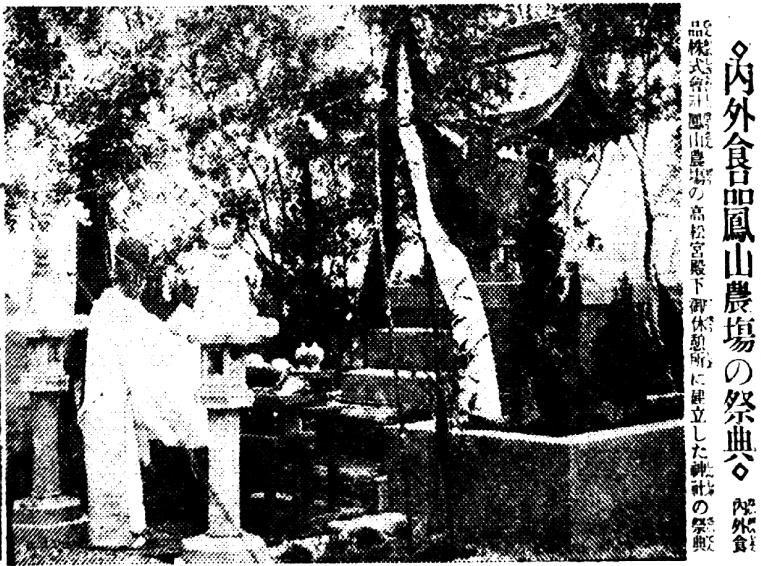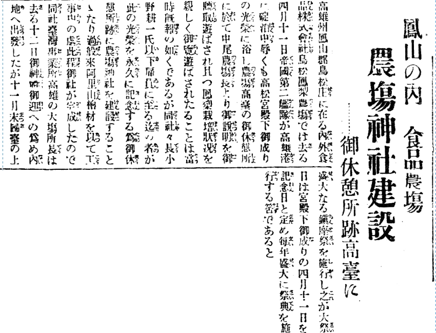 依據《臺南新報》1933年10月17日報導,內外食品株式會社為紀念這份榮光,社長小野耕一及全體雇員,決議於御休憩所舊址的高臺,採用阿里山檜木來建造農場神社;臺灣事業所高雄的大場所長1933年10月12日赴日本迎請神體,預計11月返臺。將以7月11日,高松宮蒞臨之日,做為大祭日,每年盛大舉行祭典。
