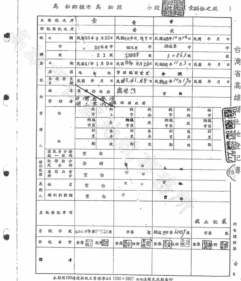 為釐清百年來之土地產權移轉過程,筆者向地政事務所申請調閱日治時期土地登記簿、光復初期舊簿及人工謄本新簿。本文以果嶺自然公園範圍內之鳥松庄185-9舊地號為例,將三個不同時期之產權紀錄整理列示於圖13、圖14、圖15,藉以呈現該筆土地自日治時期之移轉情形、光復初期登記為高雄縣政府所有並再撥用予高雄工業給水廠,以及1977年土地管理機關由臺灣省澄清湖工業水廠變更回高雄縣政府之完整歷程。