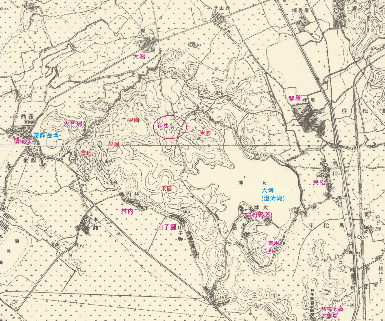 1943年出版的臺灣地形圖,在鳥松庄大埤山、今澄清湖中興塔附近,標示有一處神社圖示。此一標示長年以來困惑著高雄地區的文史研究界。依地形圖所示,該神社位於50公尺等高線的山丘平台,高程約為50公尺。經比對與套疊舊地圖與現況圖資後,可推定此「農場神社」約在現今澄清湖中興塔所在之山丘附近。