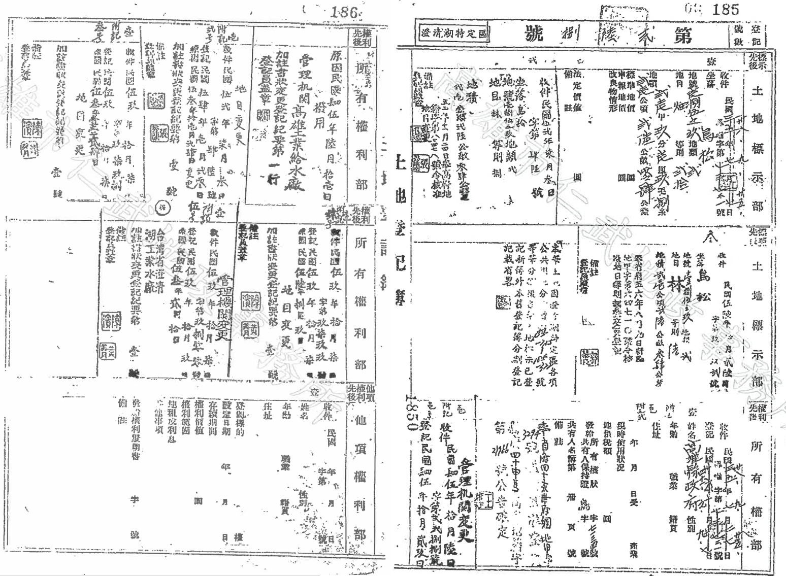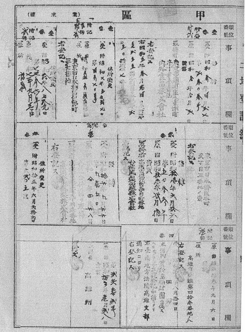 為釐清百年來之土地產權移轉過程,筆者向地政事務所申請調閱日治時期土地登記簿、光復初期舊簿及人工謄本新簿。本文以果嶺自然公園範圍內之鳥松庄185-9舊地號為例,將三個不同時期之產權紀錄整理列示於圖13、圖14、圖15,藉以呈現該筆土地自日治時期之移轉情形、光復初期登記為高雄縣政府所有並再撥用予高雄工業給水廠,以及1977年土地管理機關由臺灣省澄清湖工業水廠變更回高雄縣政府之完整歷程。
