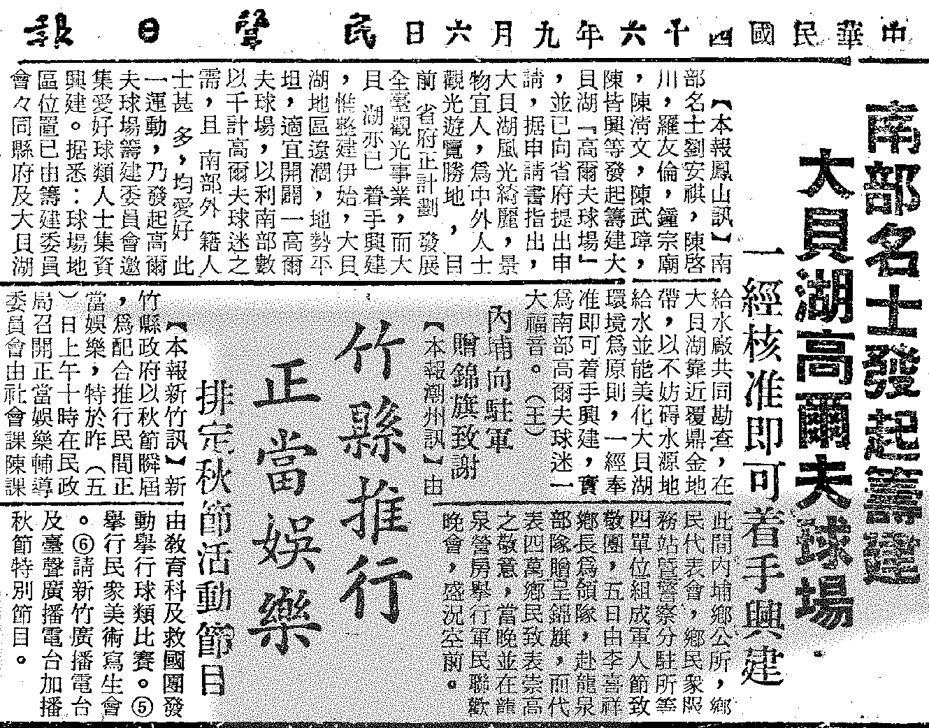 「高雄果嶺自然公園」前身為1961年成立的大貝湖高爾夫球場,後由高雄市政府收回經營權,並於2025年10月轉型為面積約70公頃的綠地型果嶺自然公園。該高爾夫球場之前身,為日治時期內外食品株式會社所經營之鳳山農場;1934年亦曾於大埤山設立農場神社。相關文史資料很早已引起筆者關注,雖留存部分老照片可供對照,然長期以來苦無入園勘查之機會。