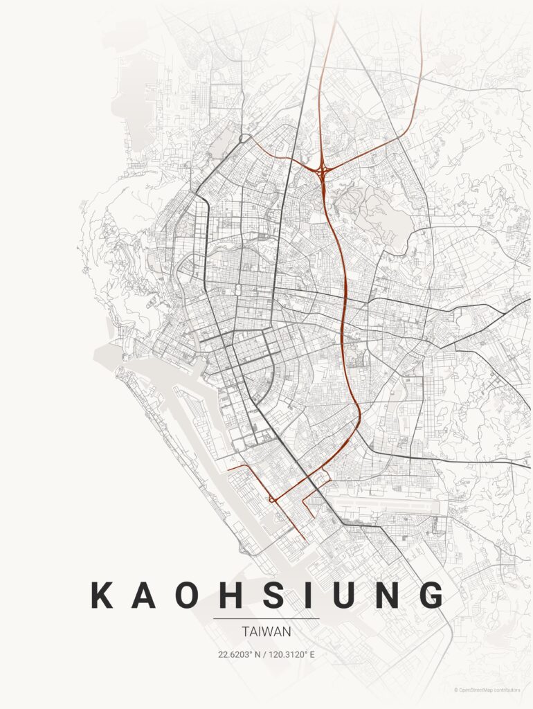 範例三:python create_map_poster.py –city Kaohsiung –country Taiwan –theme japanese_ink –distance 35000