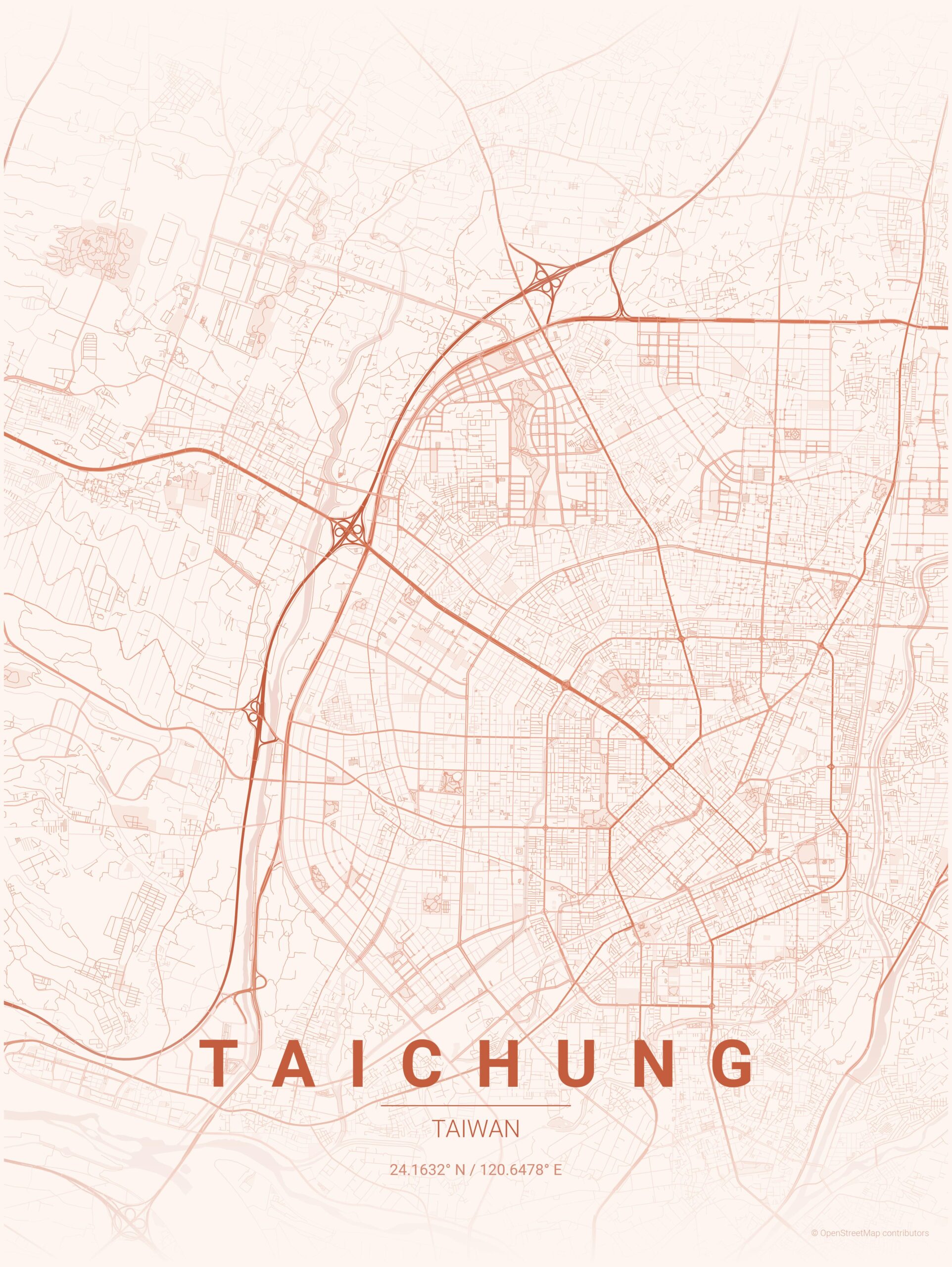 範例二:python create_map_poster.py –city Taichung –country Taiwan –theme sunset –distance 25000