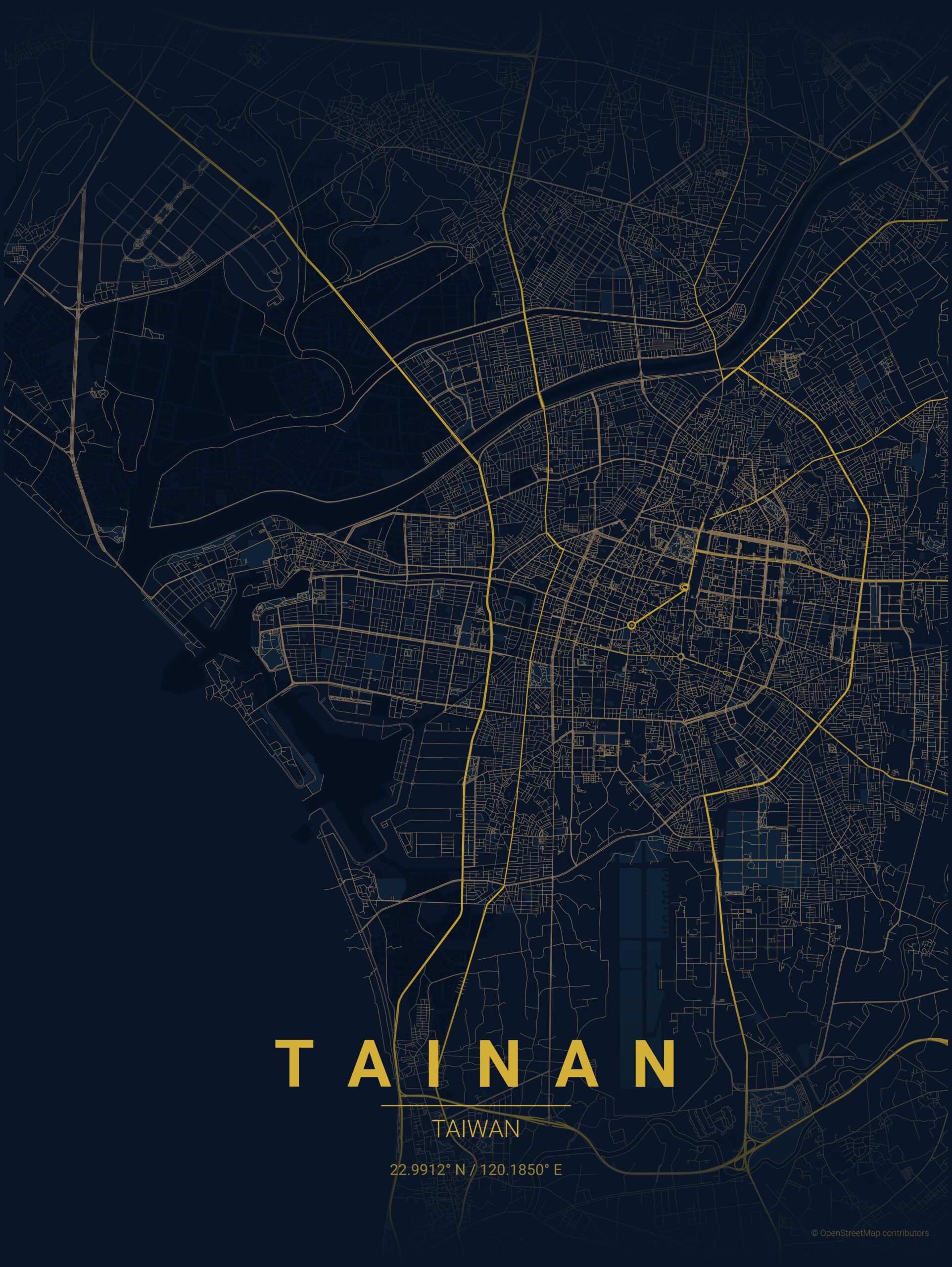 python create_map_poster.py --city Tainan --country Taiwan --theme midnight_blue --distance 25000
