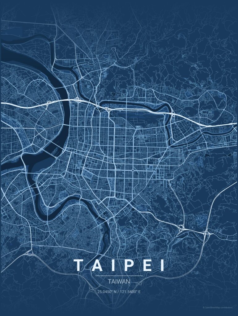 範例一:python create_map_poster.py –city Taipei –country Taiwan –latitude 25.045 –longitude 121.54 –theme blueprint –distance 30000