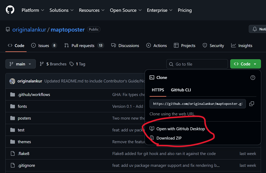 可以透過 GitHub Desktop 或者 直接下載ZIP,複製全部 MapToPoster 程式碼,安裝到指定目錄下,例如 c:\py\maptoposter。