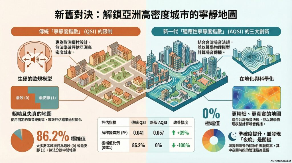 本專題中心詹大千研究員、兼任研究助理政治大學地政所林佳瑢同學、研究助理范志中先生及唐嘉宏博士(目前任教於淡江大學統計與資料科學學系)共同於國際期刊 Noise Mapping上發表研究論文。本研究針對亞洲高密度城市提出「適應性寧靜指標」(AQSI),旨在解決歐洲QSI模型在混合土地使用環境中的限制。AQSI透過整合物理音傳播模型、在地法規及時段區分(日、晚、夜),並利用新北市長期監測數據進行驗證。結果顯示,AQSI與實測噪音的關聯性比原本歐盟所提出的QSI模型相比解釋力提升39%,並成功消除極端值飽和現象。研究強調夜間為噪音管理的關鍵時段,為城市寧靜規劃提供了更具精確性與在地脈絡的評估工具。