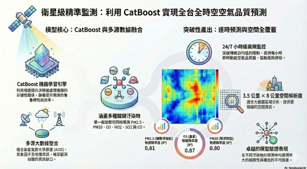本專題中心詹大千研究員與兼任研究助理林威漢同學(臺大公共衛生學院健康數據拓析統計研究所 )發表於國際期刊 Scientific Reports上,該研究探討如何利用韓國GEMS 靜止軌道衛星觀測結合地面監測站、氣象及地理資訊,建立一個能精準預測臺灣地面六種主要空氣污染物(PM₂.₅、PM₁₀、O₃、NO₂、CO、SO₂)的小時濃度模型。研究團隊採用 CatBoost 機器學習演算法開發出多輸出預測框架,有效克服了傳統觀測站空間分布不均以及低軌道衛星時間解析度不足的限制。為了確保模型在實務應用中的可靠性,研究引入了滾動預測驗證策略以防止時間數據洩漏,並透過 SHAP 分析揭示氣象因子與衛星氣溶膠數據對污染物形成的影響。實驗結果顯示,該模型在預測臭氧方面表現最為優異,且能提供全臺連續的網格化空品動態圖,為公共衛生評估與政策制定提供科學基礎。