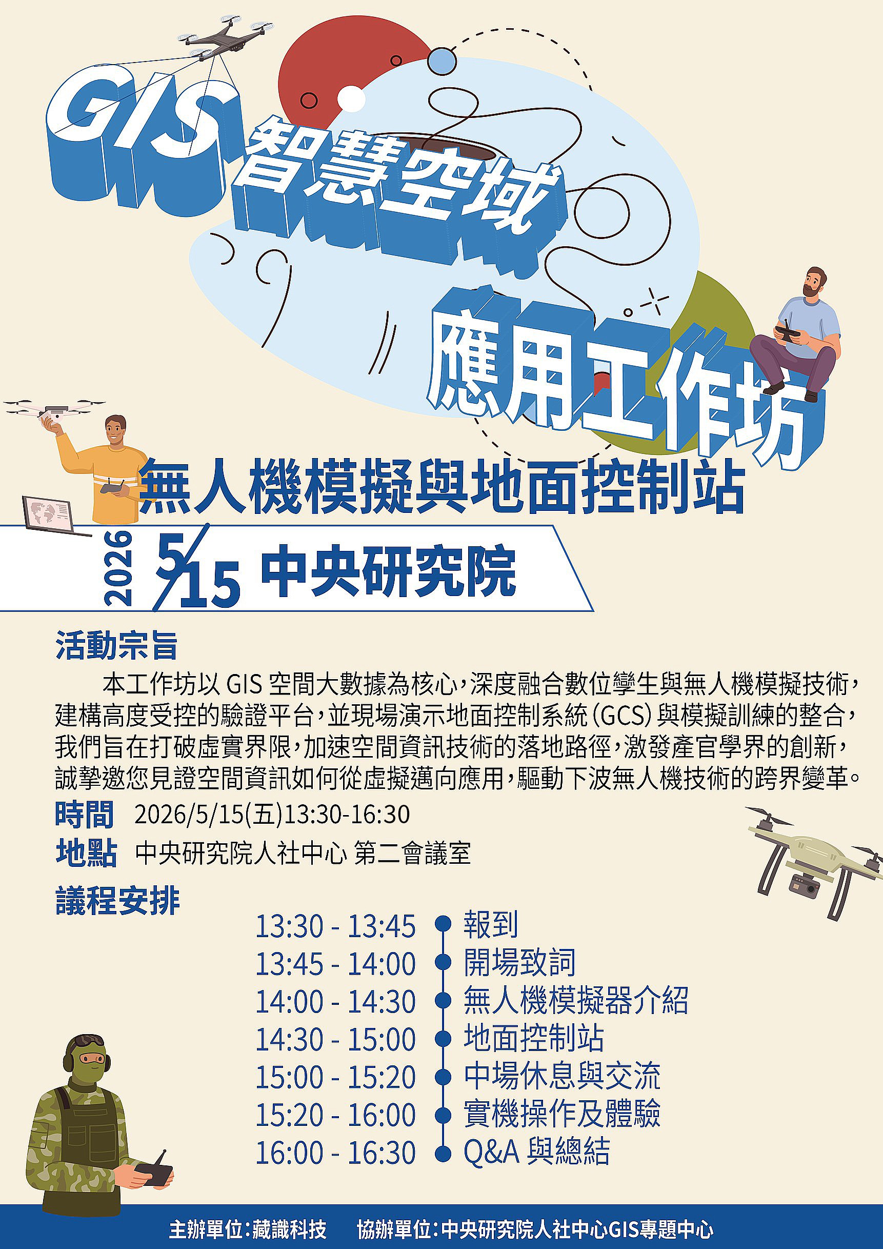 學術活動工作坊GIS智慧空域應用工作坊On2026 年 4 月 17 日In學術活動, 工作坊 主題:無人機模擬器與地面控制站介紹 宗旨:本工作坊以GIS空間大數據為核心,深度融合數位孿生與無人機模擬技術,建構高度受控的驗證平台,並現場演示地面控制系統(GCS)與模擬訓練的整合;期望打破虛實界限,加速空間資訊技術的落地路徑,激發產官學界的創新。 時間:2026/5/15(五) 13:30~16:30地點:中央研究院人社中心 第二會議室 主辦單位:藏識科技有限公司協辦單位:中央研究院人社中心GIS專題中心